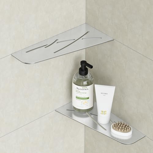 Biutimarden 2PC Corner Shelves, No Drilling Wall Mounted Storage Basket, Self Adhesive Shower Organiser Storage, Stainless Steel Bathroom Shelf for Shower, Toilet and Kitchen (Brushed)