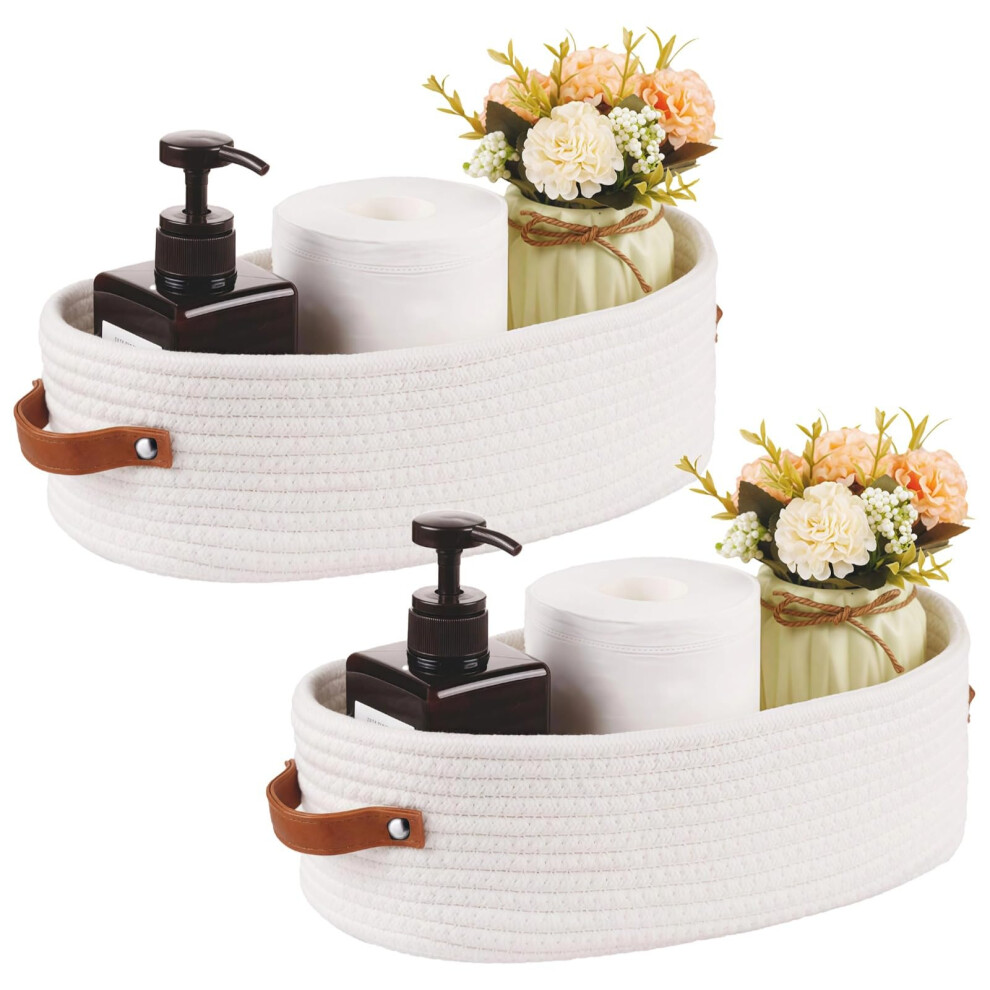 2-Pack Oval Cotton Rope Storage Baskets with Leather Handles for Bathroom and Nursery Organization in Natural Color