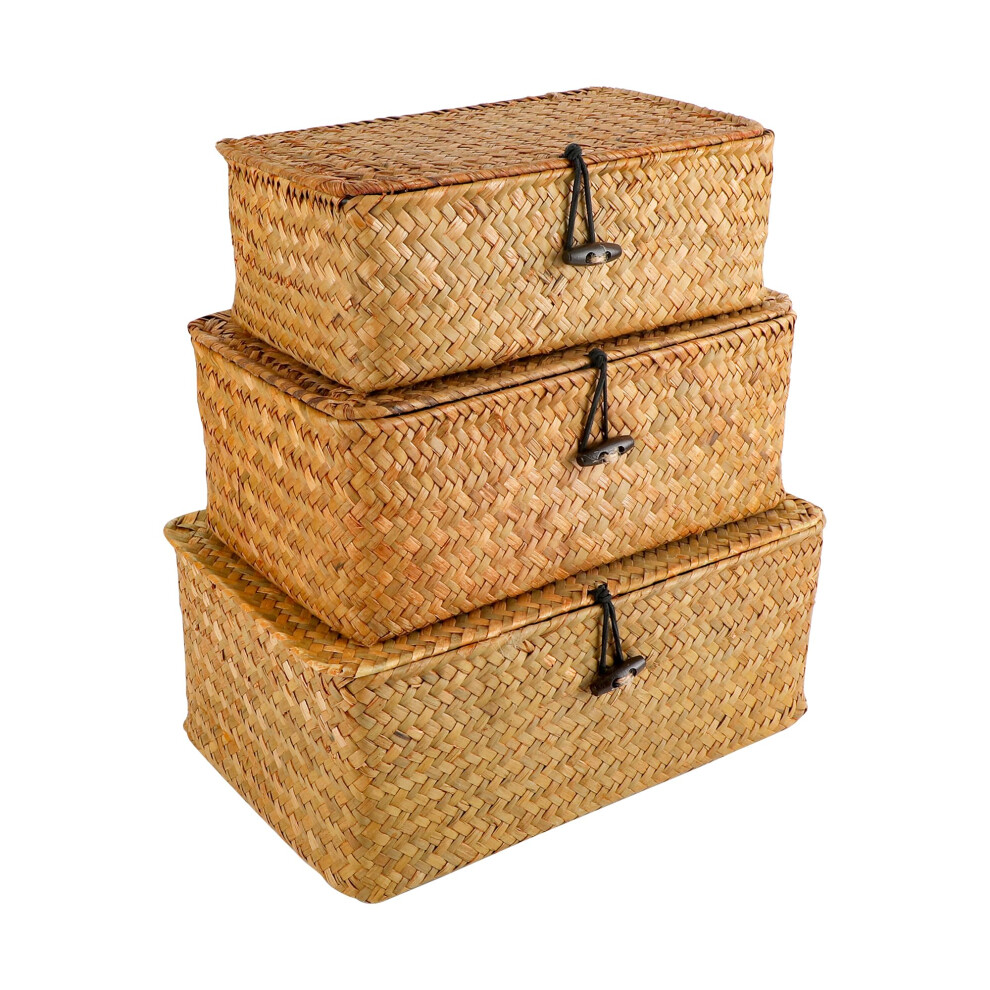 Rattan Woven Storage Basket Set of 3 With Lids, Rectangular Seagrass Baskets in S M L Sizes for Home Bathroom Closet