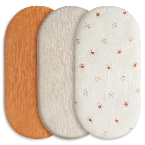 Baby Mattress Cover, Fitted Sheet, Pack of 3, 100% Muslin Cotton,Oeko-Tex 100,Muslin Bassinet Sheets,Bassinet Cover,Pram Mattress Cover,83 x 43 x 10 cm,Fitted Sheet for Prams, Bassinets(Sun)