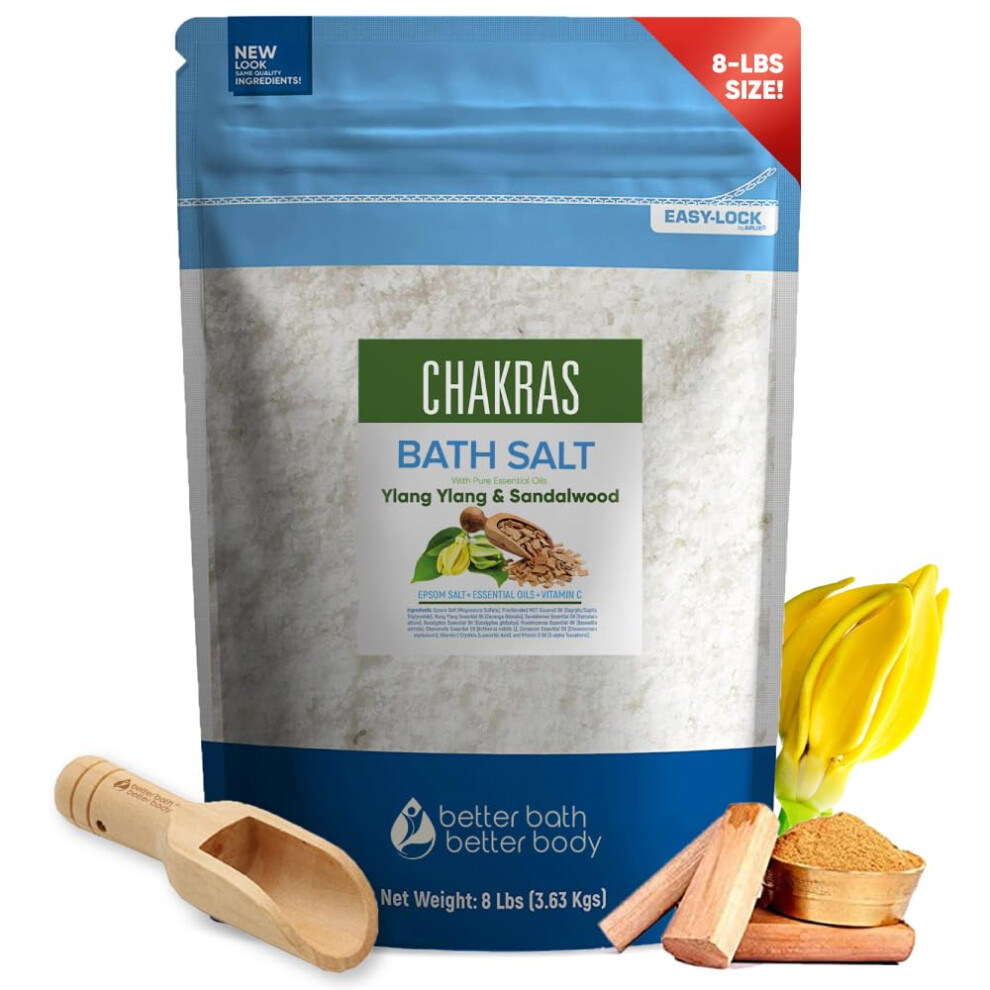 Chakras Bath Salt 128 Ounces (8 Lbs) Epsom Salt with Natural Ylang Ylang and Sandalwood Essential Oils Plus Vitamin C in BPA Free Pouch with Easy Pres