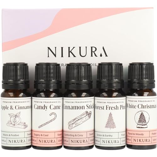 Nikura Christmas Fragrance Oil Gift Set - 5 x 10ml | Perfect for Diffusers for Home, Soap & Candle Making, Wax Melts, Burners | for use in Bath Bombs, Perfume Scents | Vegan & UK Made Essential Oils