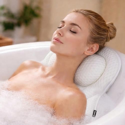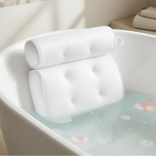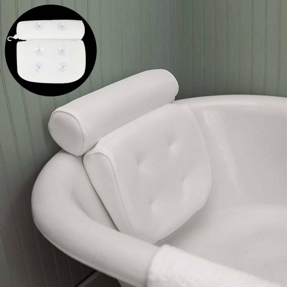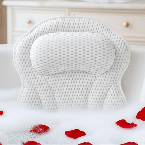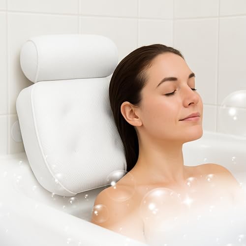 Bath Pillow for Bathtub - 7 Strong Suction Cups & Hook, 4D Air Mesh Head Neck Back Support, Quick Dry Luxury Spa Cushion, Fits All Bathtubs and Hot Tubs (White)