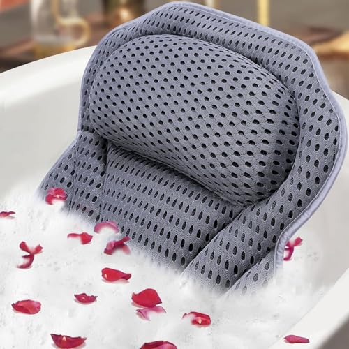 Bath Pillow for Bathtub with 7 Strong Suction Cups & Hook, 4D Air Mesh Head Neck Back Support, Quick Dry Luxury Spa Cushion, Fits All Bathtubs Hot Tubs (Grey)