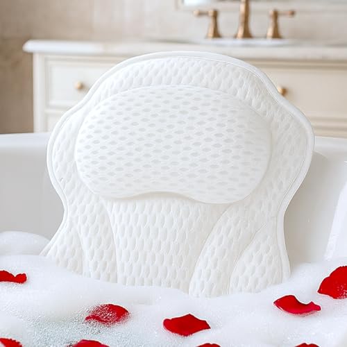 Bath Pillow 4D Ergonomic Bath Pillow Neck and Back Support Bath Cushion Air Mesh Technology Bath Headrest Pillow Bath Pillows with Strong Suction Cups Fits All Bathtub, Hot Tub and Home Spa (White)