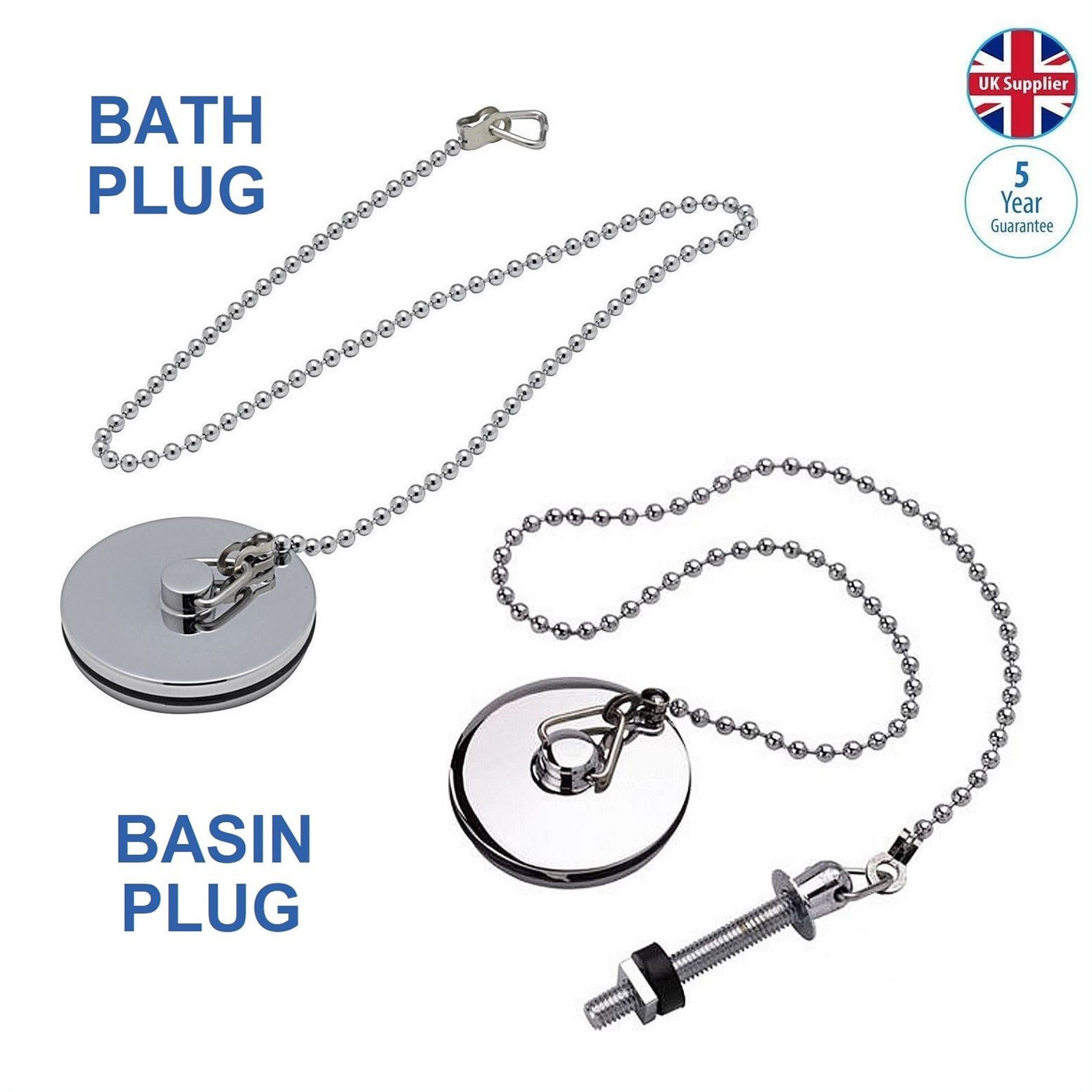 2 Stainless Steel Retainer Bath Waste and Overflow 45cm Ball Chain Plus Plug UK