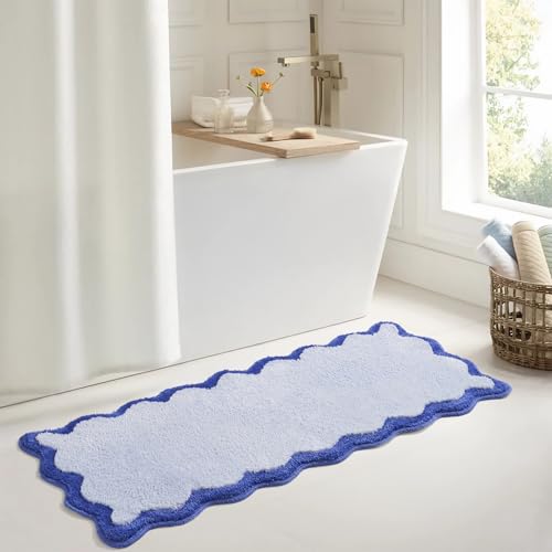 DyeFury Luxury Cute Bathroom Runner Rugs, Blue Bath Mat W/Navy Blue Scalloped Edge, Microfiber Aesthetic Trendy Funky Fun Preppy Rug, Extra Soft Bathroom Mat Non-Slip for Tub, Shower, 47'' x 20''