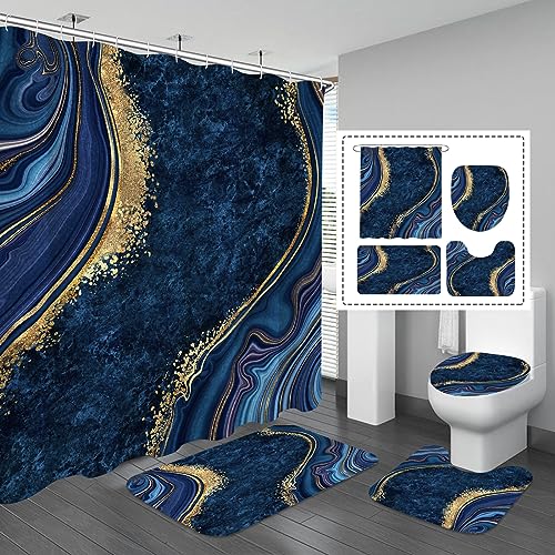 Gibelle 4 Pcs Luxury Marble Shower Curtain Set with Non-Slip Rugs, Toilet Lid Cover and Bath Mat, Gold Foil Navy Blue Bathroom Decor Set with Shower Curtain and Rugs and Accessories