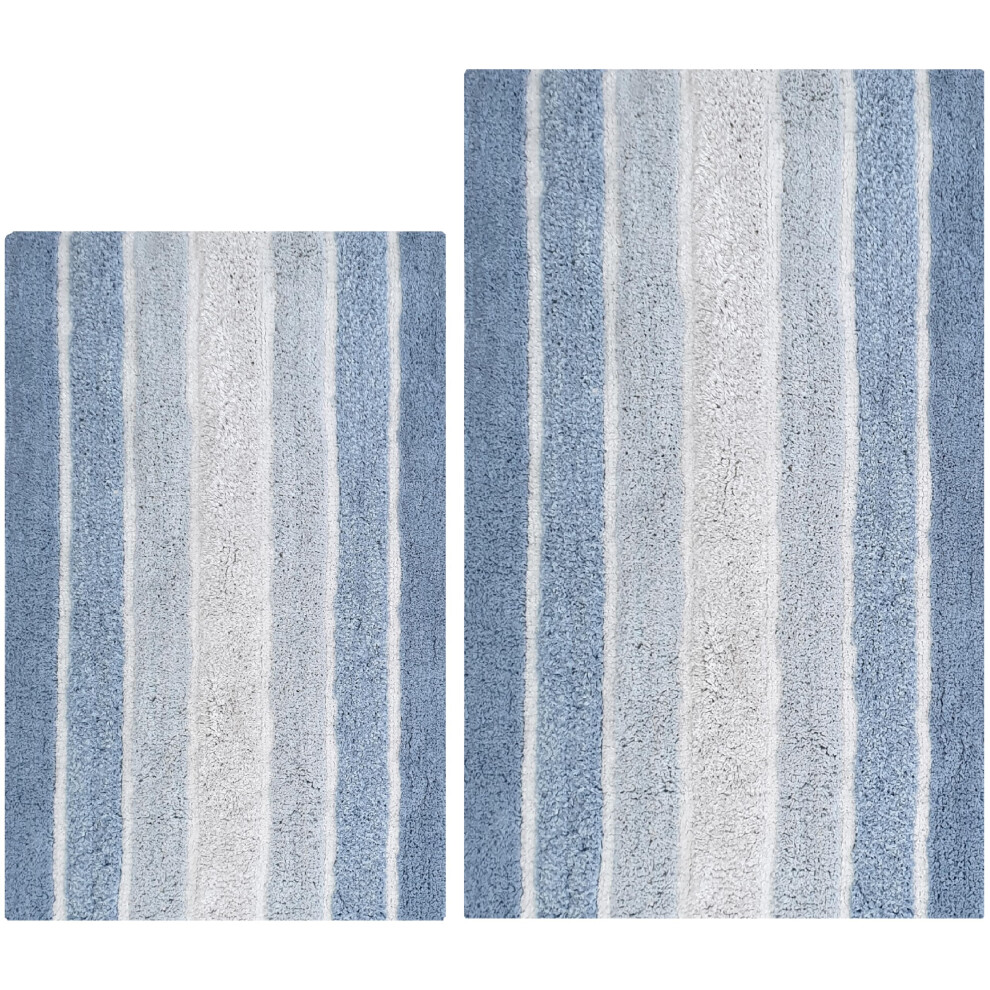 THE BEER VALLEY Bathroom Rugs Set 2 Piece in 100% Cotton Alpine Stripe 21x32/17x24 - Blue Reversible Bath Rugs Set Cotton Bath Mat Cotton Bath Rugs