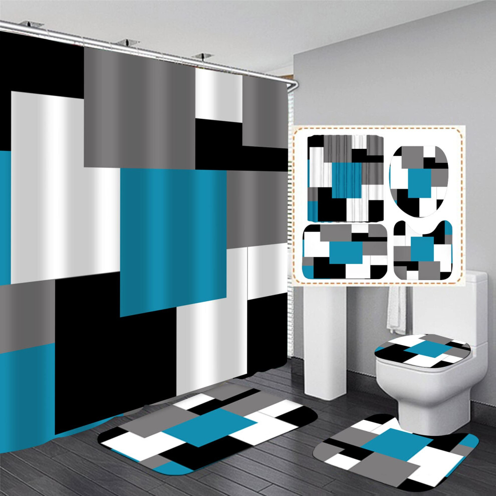 Yddsky 4 Pcs Blue Geometric Shower Curtain Sets with 12 Hooks Non-Slip Rugs U-Shaped Bath Mat Toilet Cover Abstract Geometric Modern Black and Blue