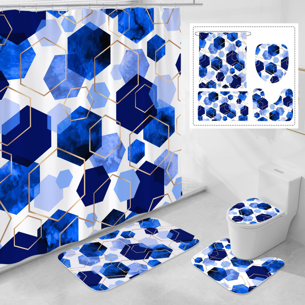 Litabel 4 Pcs Royal Blue Modern Geometric Shower Curtain Set with NonSlip Rugs Toilet Lid Cover and Bath Mat Abstract Bathroom Decor Set with Shower