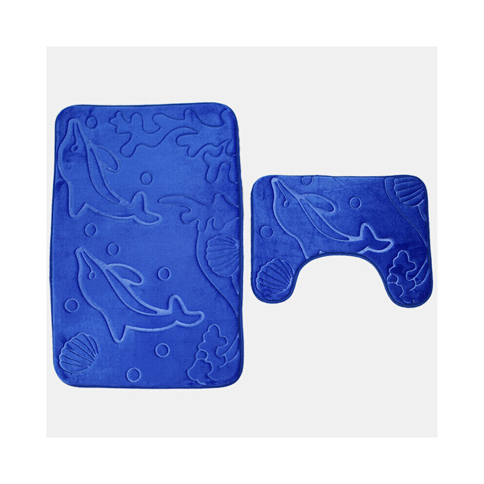 (Blue) 2pcs 3D Dolphin Flannel Toilet Lid Bath Rugs Soft Floor Home Anti Slip Shower Carpets Bathroom Mat Set