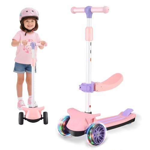 Wheelive 2 in 1 Kids Scooter with Removable Seat, Light up 3 Wheels Kick Scooter with 4 Adjustable Height Toddler Scooters Sit or Stand Ride for Boys & Girls 2-10 Years Old,Pink