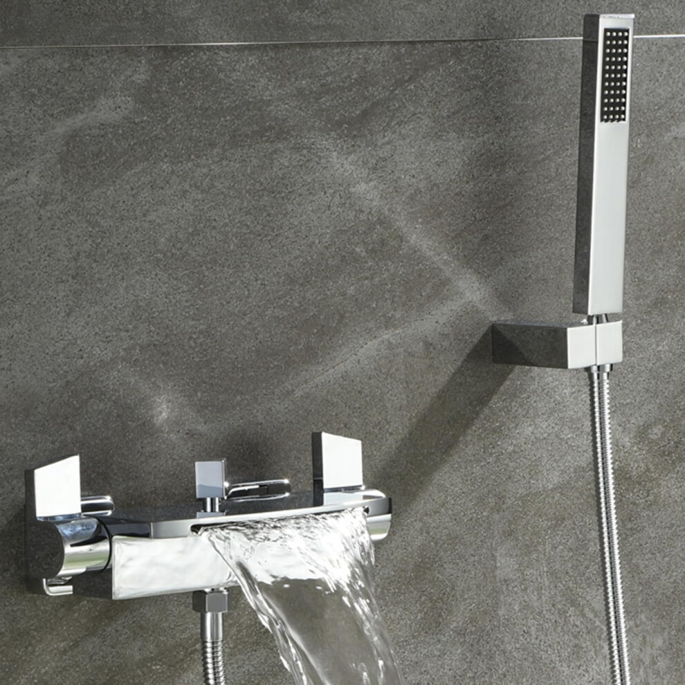 Double Handle Brass Waterfall Bath Tap With Shower Attachment, Wall Mounted Bath Mixer Faucet Set, Silver