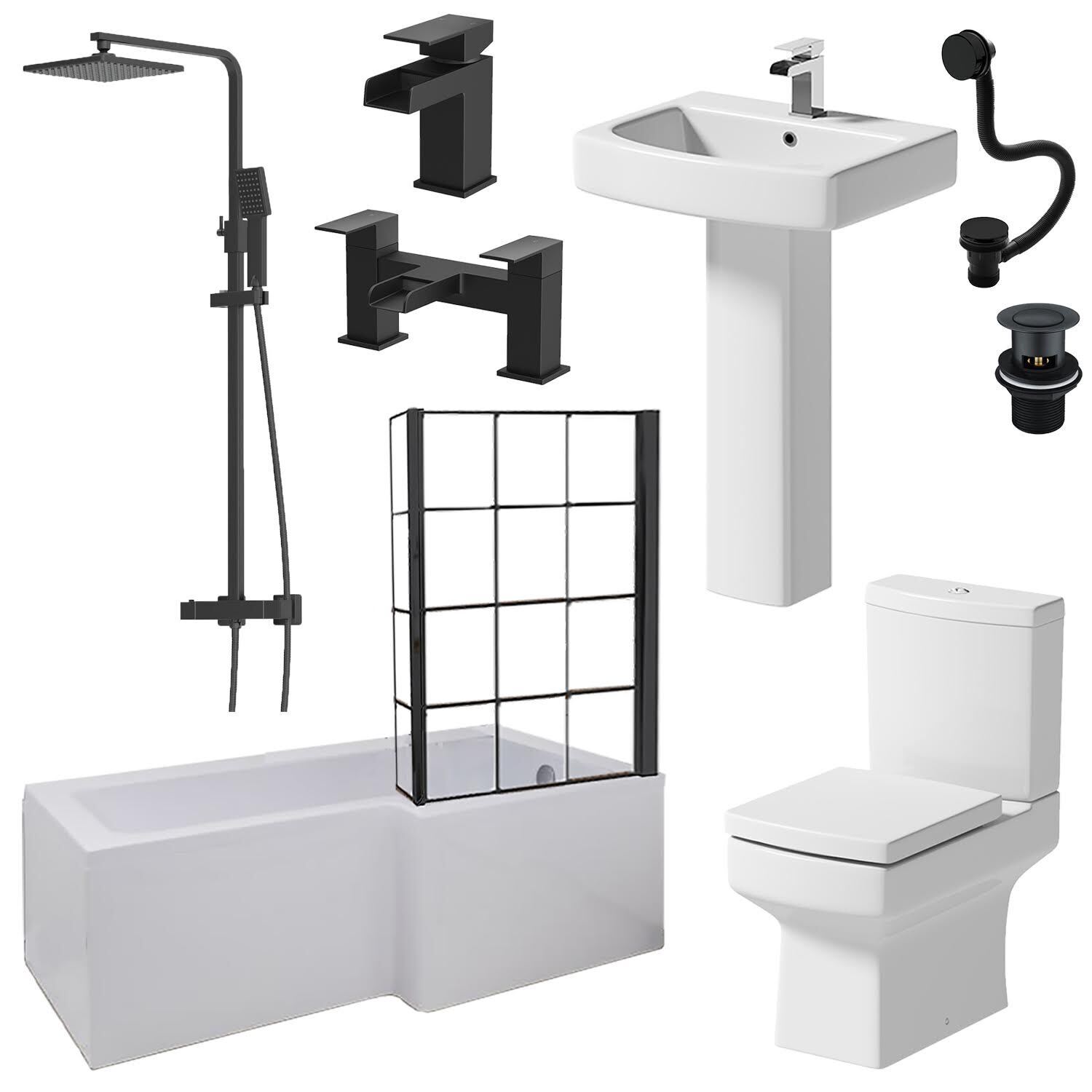 Black Bathroom Suite 1700mm RH Bath Toilet Basin Taps Shower Screen Waste
