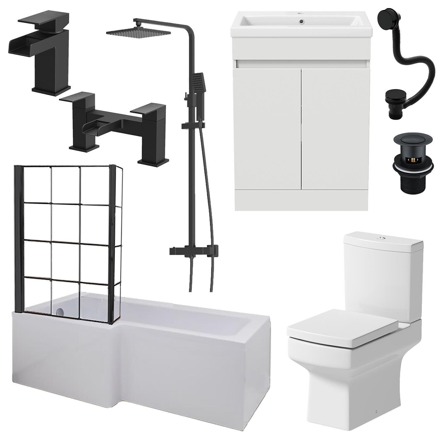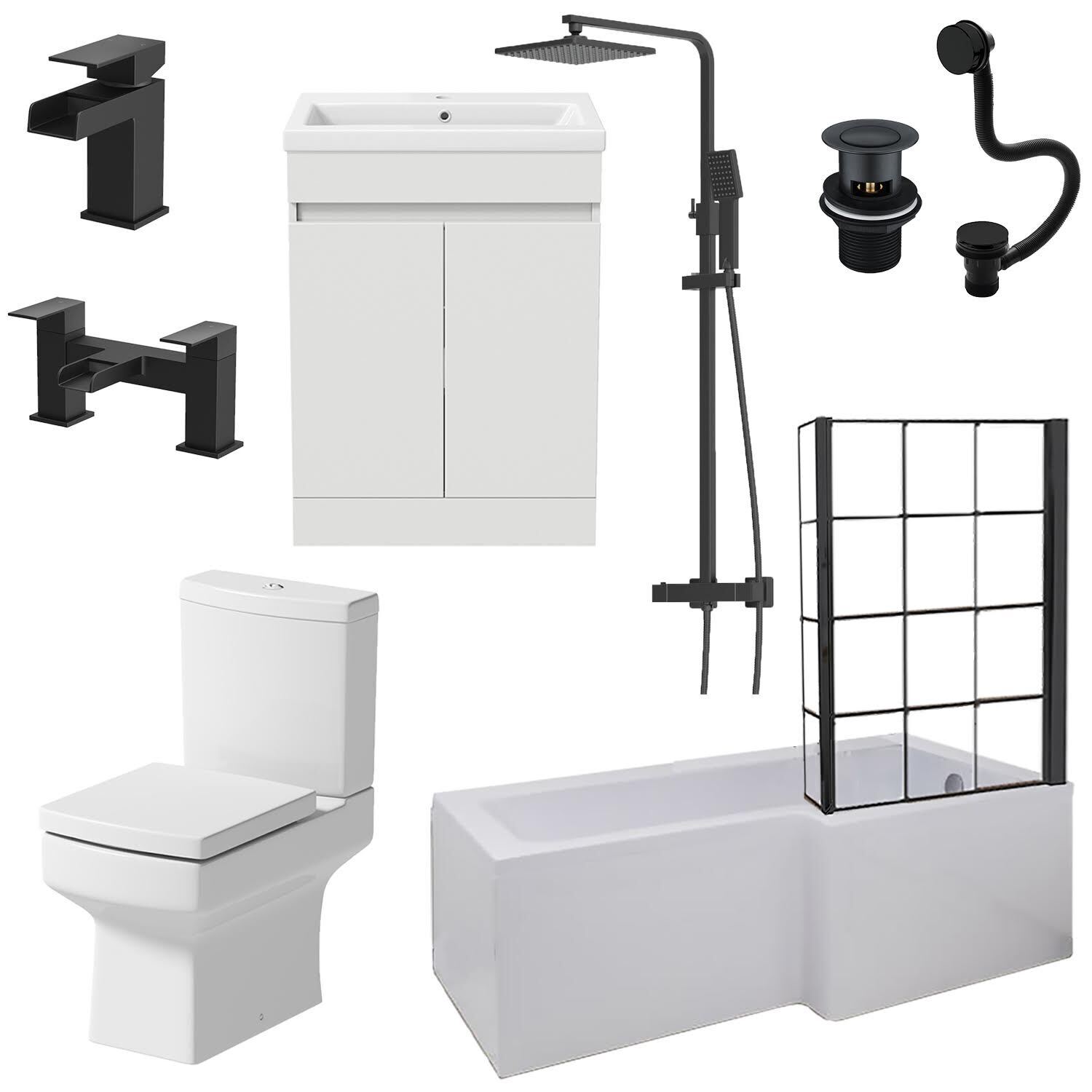 Black Bathroom Suite 1700mm LH Bath Toilet Vanity Taps Shower Screen Waste