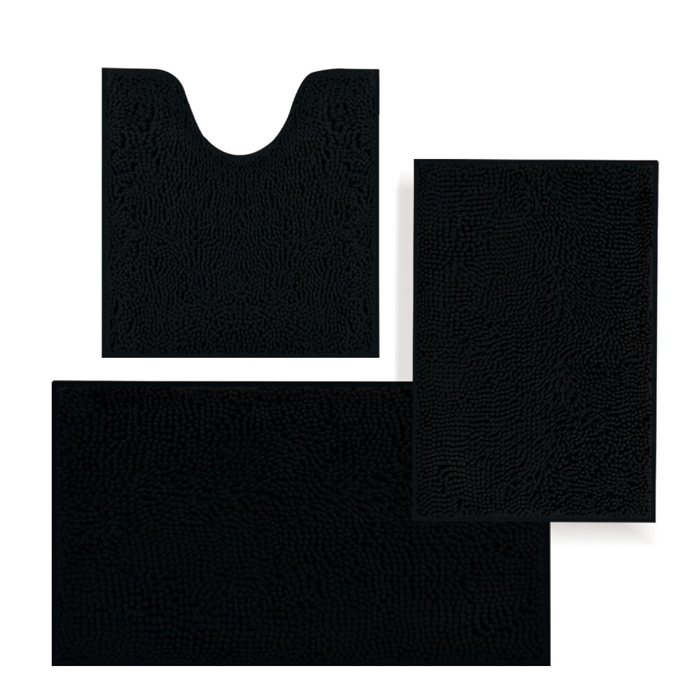 placeroom Bathroom Mat Set of 3, Bath and Toilet Mat Set,Ultra Soft Chenille Bath Mat Non Slip,Bath Mat Sets 3 Piece Washable,Super-Absorbent Bath(Black bath set)