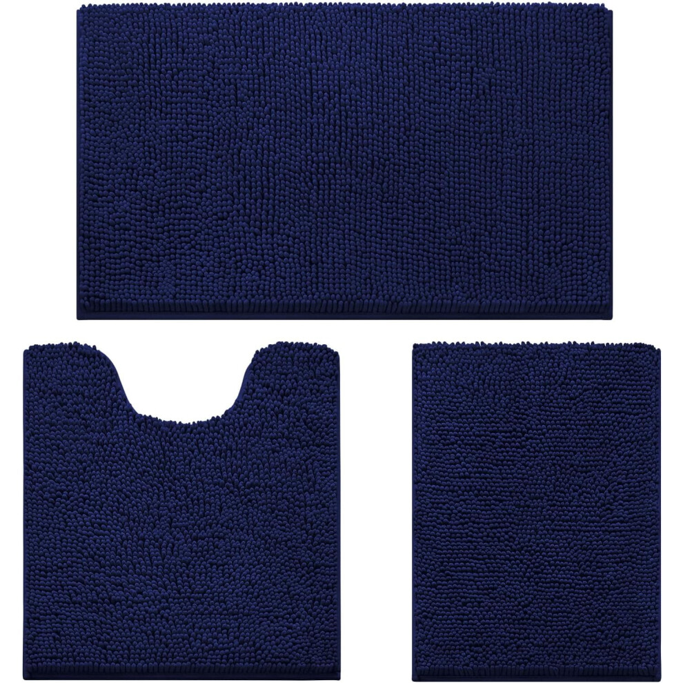 3 Pieces Bathroom Rugs, Ultra Soft Non Slip Absorbent Chenille Toilet Bath Mat Set (Navy Blue)