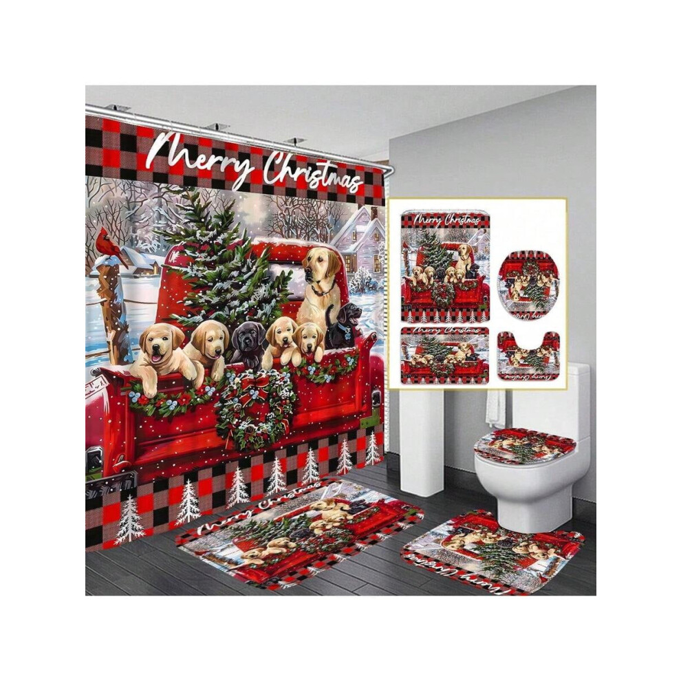 Snow Shower Curtain Set 4Pcs, Waterproof Wreath Dog Red Car Decor w/12 Hooks, Anti-Slip U-Shaped Bath & Toilet Mat Set, 70.8x70.8 Inch