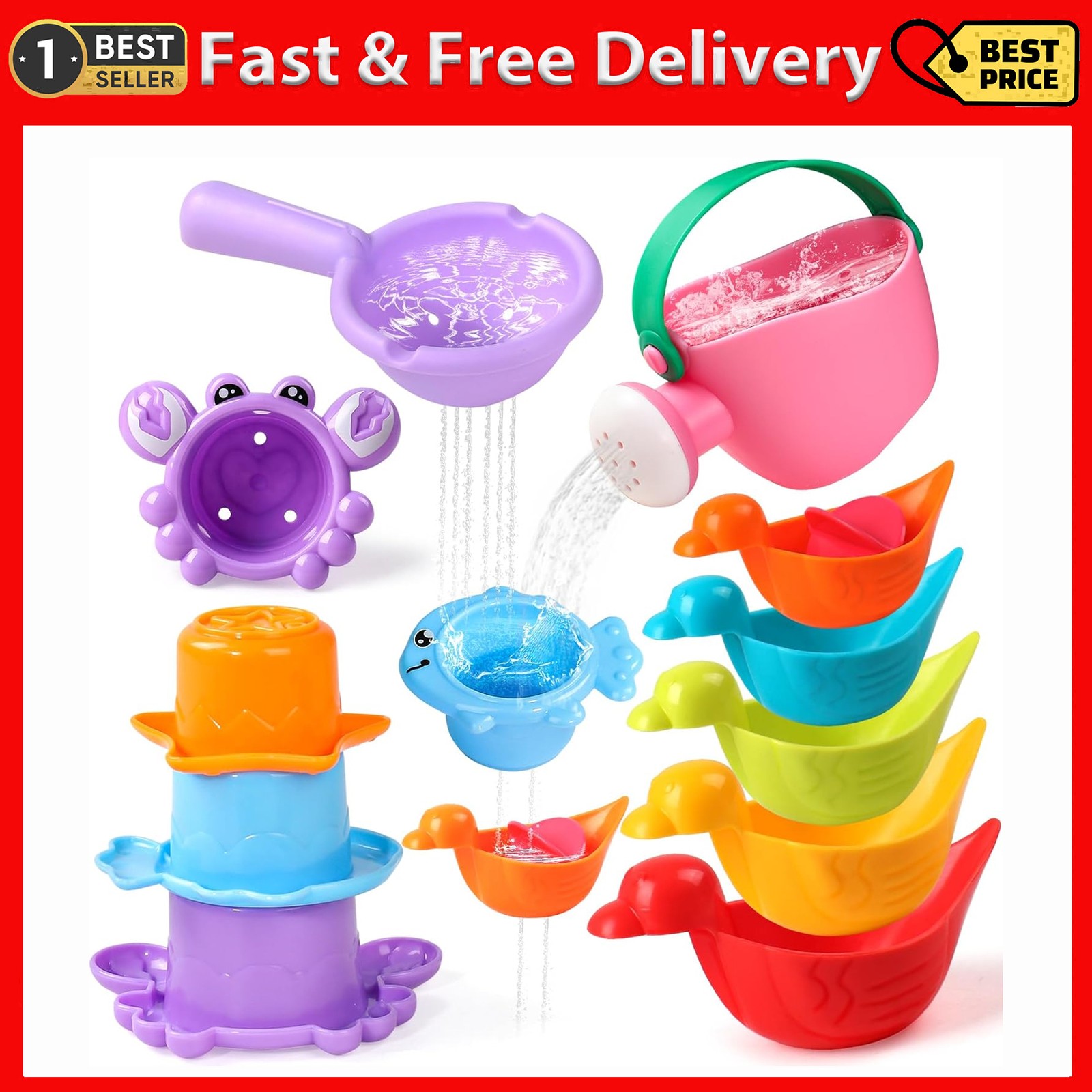 Baby Bath Toys for 1 2 3 Year Olds Boys Girls, 9pcs Water Play Swimming Pool Toys Mold Free Stacking Cups Watering Can Bath Boats Bathtub Present for Toddler Kids (5pcs water bath toys)
