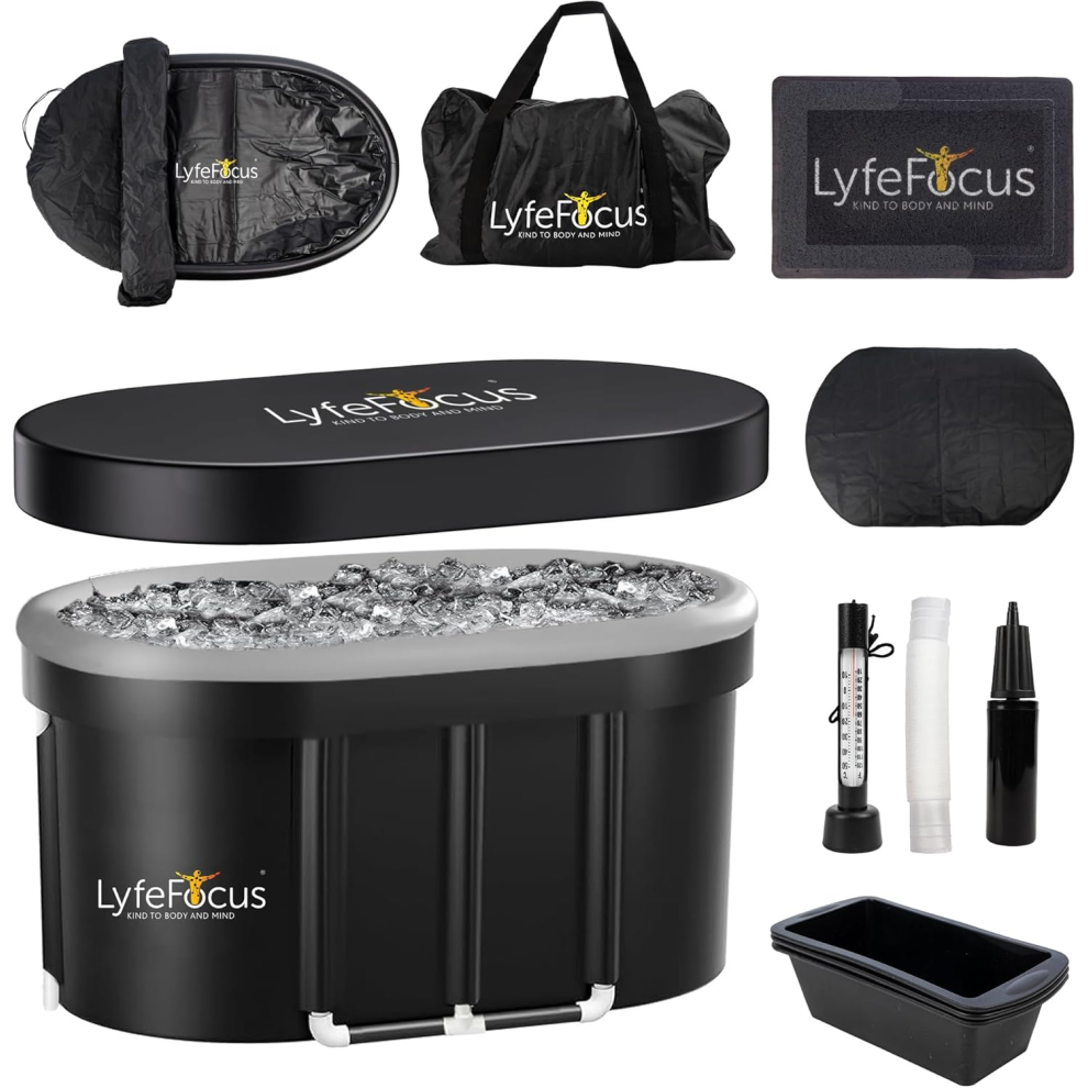 LyfeFocus Cold Therapy Pod – Premium Recovery Ice Bath Tub with Thermometer, Foot Mat, Protection Lid, Groundsheet, Reusable Ice Blocks and Set Up Accessories (Black Base, Black Top, Large 100cm)