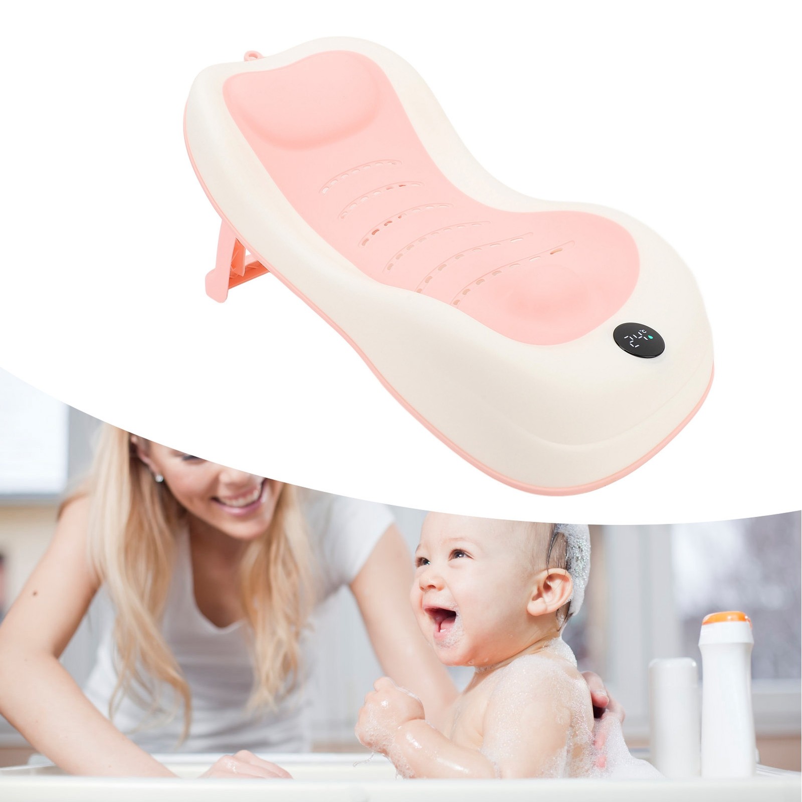 Pink Foldable Baby Bath Support With Thermometer Slip Resistant Ergonomic I FI