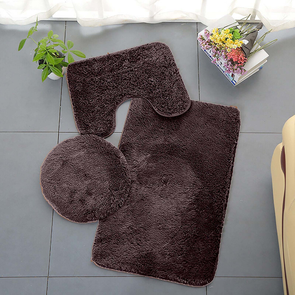 (Brown) 3pc Bathroom Set Rug Mat Toilet Lid Cover Plain Color Bathmats