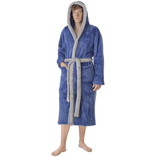 FashGudim Mens Robes Big and Tall with Hood Flannel Fleece Men Bathrobe with Hood Full Length Plush Long Robe Warm House Robe (Navy, L/XL)