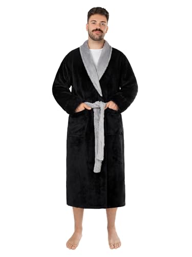 LEBENGOOD Men’s Dressing Gown Winter – Soft Fleece Robe with Hood, Warm Long Housecoat Bathrobe in Microfiber OEKO-TEX®, Black, L