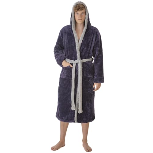 LEBENGOOD Men’s Dressing Gown Winter – Soft Fleece Robe with Hood, Warm Long Housecoat Bathrobe in Microfiber OEKO-TEX®, Marengo, L