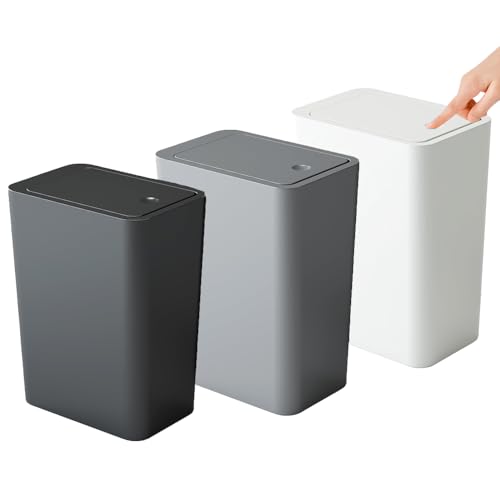 3 Pack Bedroom Bin,10L Slim Bathroom Bin with Lid,Push Button Plastic Waste Bin for Bathroom Anti-Odour,Plastic Thin Trash Can for Office,Living Room,Kitchen,Toilet (White,Black,Grey)