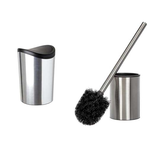 TATAY Bathroom Bin with Tipping Lid, 6L Capacity, Metallic. + Toilet Brush Satin, Stainless Steel, Black brush.
