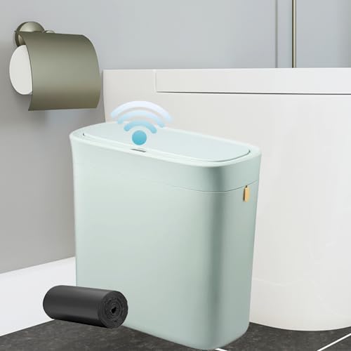 ianomla Automatic Bathroom Bin with Lid, 12L Slim Sensor Garbage Can, 2.6 Gallon Plastic Waterproof Motion Sensor Rubbish Bin with Trash Bags, for Bedroom, Living Room, Narrow Space, Morandi Green
