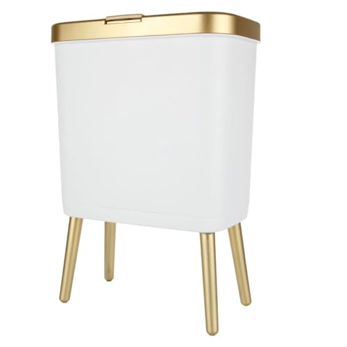 Procade - Bathroom Waste Bin with Lid, Plastic, with Legs, 15 Litres, Gold, with Push Button Opening, Slim, White, for Bedroom, Living Room, Office, Pet Proof