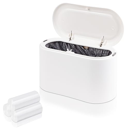 SHAIDOJIO Small Bin, Small Bathroom Bin with Lid and 90PCS Trash Bags, Removable Desk Plastic Mini Office Bins, Pop Up Mini Dustbin, Desk Trash Can for Bathroom Coffee Bar Tabletop Dresser-White