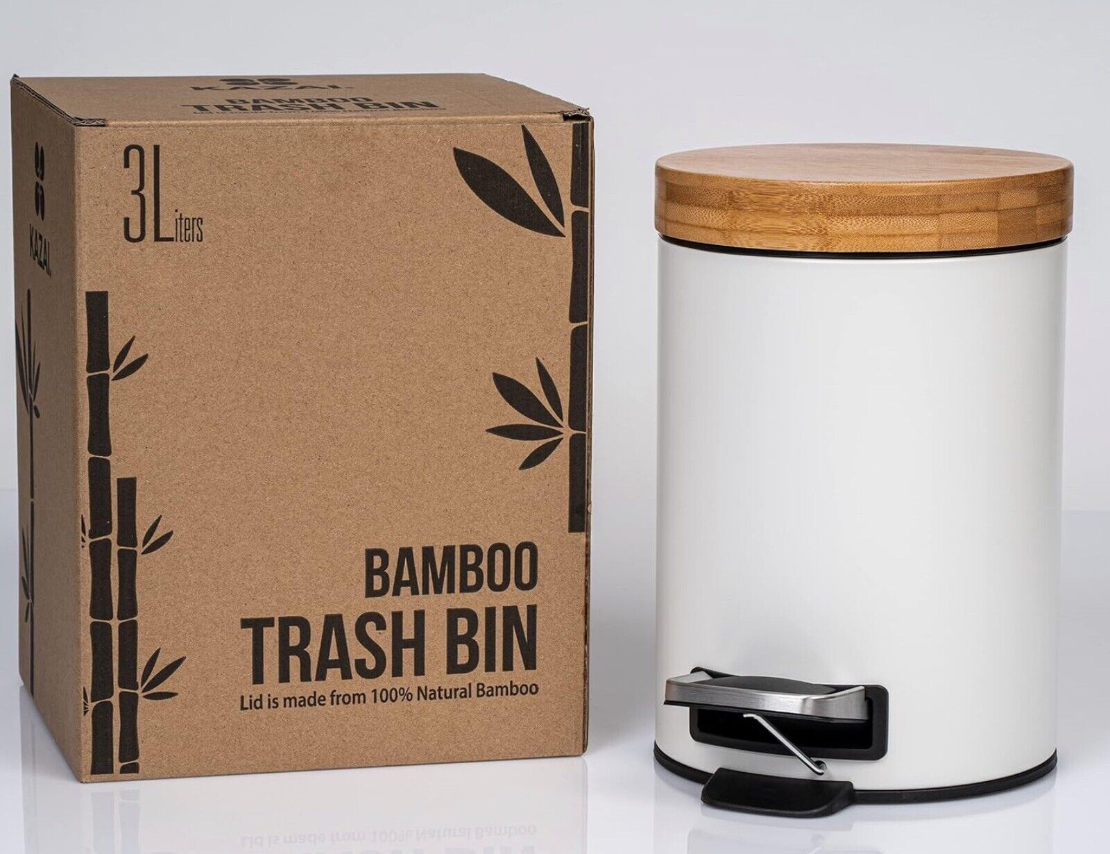 Kazai. 3L White Bathroom Bin - Superior Bamboo Lid | Soft Closing | Anti-Finger