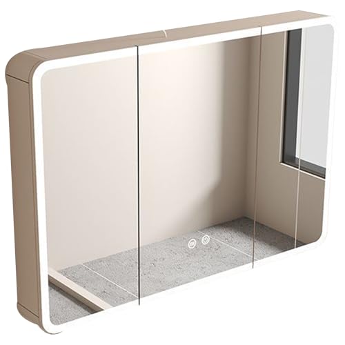 Smart Bathroom Mirror Cabinet with Led Lighting, Featuring a Fully Enclosed Rear Panel Made of Thickened Carbon Fibre Material for 360° Waterproofing with No Blind Spots. Suitable for Home Bath Khaki