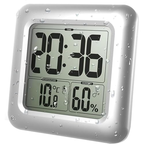 Large Waterproof Bathroom Shower Wall Clock, Big LCD Display Digital Water Resistant Indoor Outdoor Temperature Humidity Clock, Easy Read Hanging Clock for Elderly, Suction Cup, Table Stand (Silver)