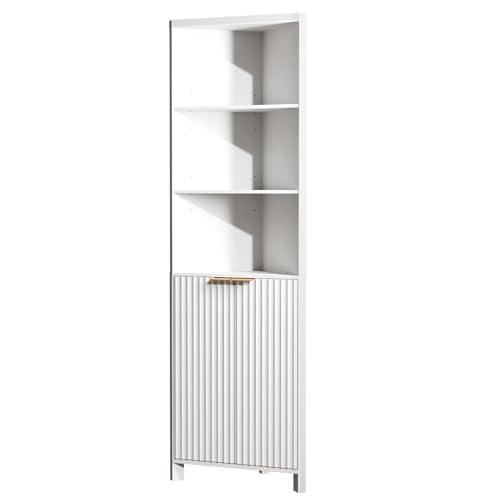 Menaka Tall Slim Corner Cabinet Bookcase with Door and 3 Shelves for Living Room Bedroom Bathroom, White Wood Unit Storage Display Shelving Cupboard Cabinet for Small Narrow Space