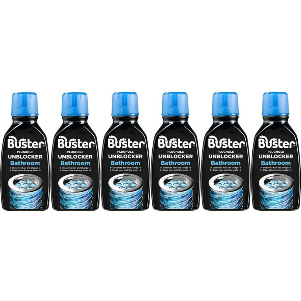 Buster Bathroom Drain Unblocker (Pack of 6 x 300ml) Fast-Acting Sink Unblocker Dissolves Hair, Sludge and Soap, Drain Cleaner Clears Blockages in Shower, Bath and Bathroom Sink Pipes - Made in UK