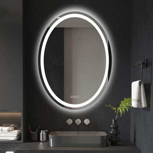 furduzz 600x800 mm Oval Led Bathroom Mirrors, Illuminated Wall-Mounted Vanity Mirror with Touch Switch, Backlit Smart Bathroom Mirror with 3 Colors Light, Anti-fog, IP44, Horizontal/Vertical