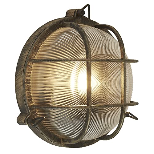Antique Brass & Ribbed Glass Outdoor Vintage Round Flush Bulkhead Wall Light | 280mm Diameter | IP44 Rated | 1 x ES E27 Lamp Bulb Required | Bathroom Use | UK Approved