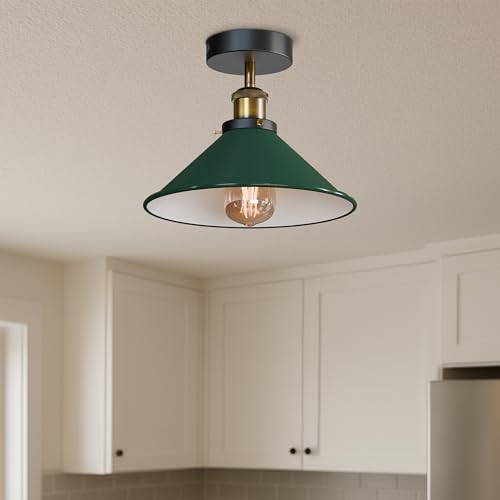 LEDSone Vintage E27 Flush Ceiling Light with 22cm Green Conical Lampshade Easy to Fit Durable Anti Rust Metal Ceilings Lighting Fixtures for Hallway, Bathroom, Bedroom, Foyer with EPC A+ Bulb