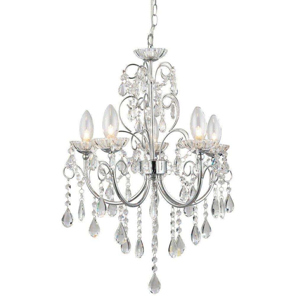 Bathroom Ceiling Pendant Light Chrome & Crystal IP44 5 Bulb Hanging Lamp Rose