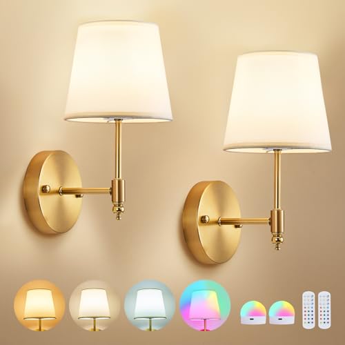 Pingxihule Battery Operated Wall Sconce Set of 2,Gold Wireless Wall Light with Remote Control,RGB Dimmable 15 Colors,Rechargeable Bulbs Cordless Lamp for Indoor Bedroom Bathroom Living Room