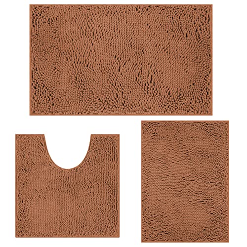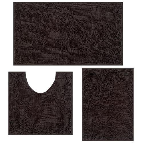 RUN HELIX Ultra Soft Chenille Bath Mat Non Slip, Bath Mat Set 3 Piece, Shaggy Bathroom Mats, Absorbent Bath Mats for Bathroom, Fluffy Bathrooms Mat Set with U-Shaped Toilet Rug (Dark Brown)