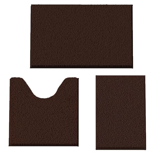 COMPOLICY PLACEROOM Bathroom Mat Set of 3, Bath and Toilet Mat Set,Ultra Soft Chenille Bath Mat Non Slip,Bath Mat Sets 3 Piece Washable,Super-Absorbent Bath(Brown bath set)