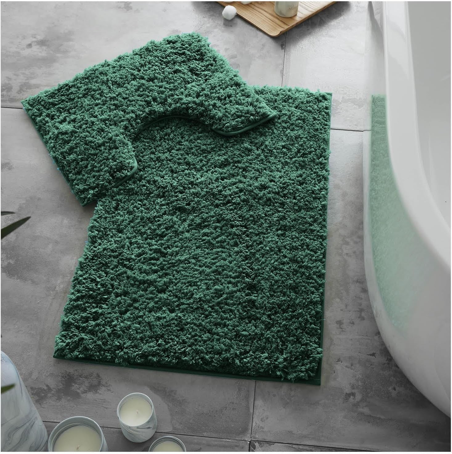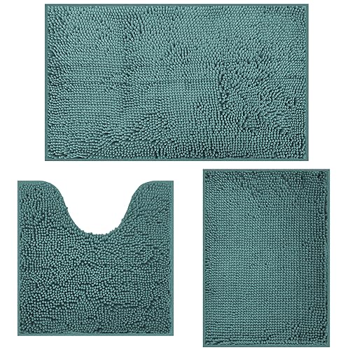 RUN HELIX Ultra Soft Chenille Bath Mat Non Slip, Bath Mat Set 3 Piece, Shaggy Bathroom Mats, Absorbent Bath Mats for Bathroom, Fluffy Bathrooms Mat Set with U-Shaped Toilet Rug (Dark Green)