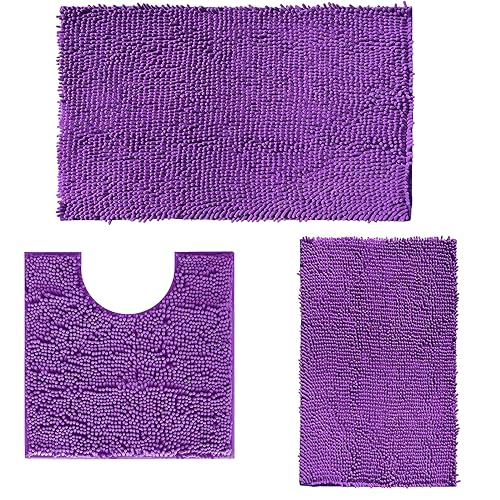 RUN HELIX Ultra Soft Chenille Bath Mat Non Slip, Bath Mat Set 3 Piece, Shaggy Bathroom Mats, Absorbent Bath Mats for Bathroom, Fluffy Bathrooms Mat Set with U-Shaped Toilet Rug (Dark Purple)