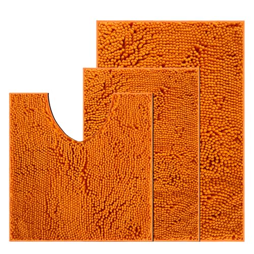 COMPOLICY PLACEROOM Bathroom Mat Set of 3, Bath and Toilet Mat Set,Ultra Soft Chenille Bath Mat Non Slip,Bath Mat Sets 3 Piece Washable,Super-Absorbent Bath(Orange bath set)